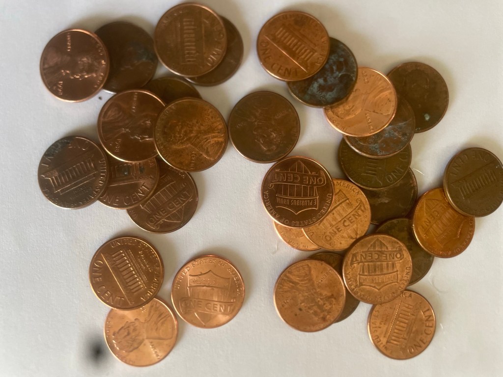 If you take a penny, toss it on the ground, it’s still a penny. If it becomes green with oxidation, it’s still a penny. If it has paper glued to one side , it’s still a penny. If it’s shiny and brand new, well it’s a new penny but still worth its original value. Some people treat Pennie’s as what’s left over, they often set them aside and many leave them behind for someone else to use as needed, these actions do not reduce the value of that penny.